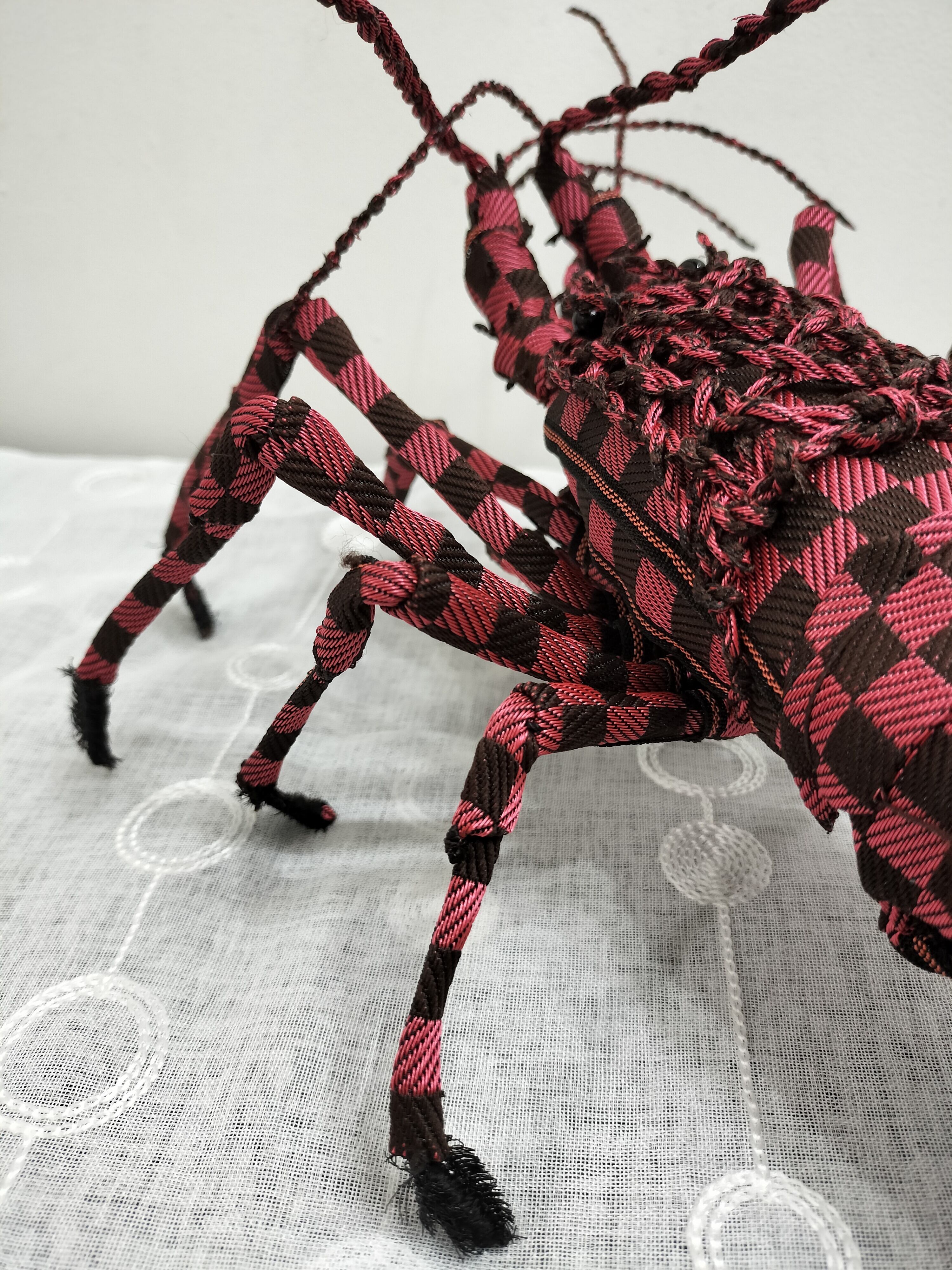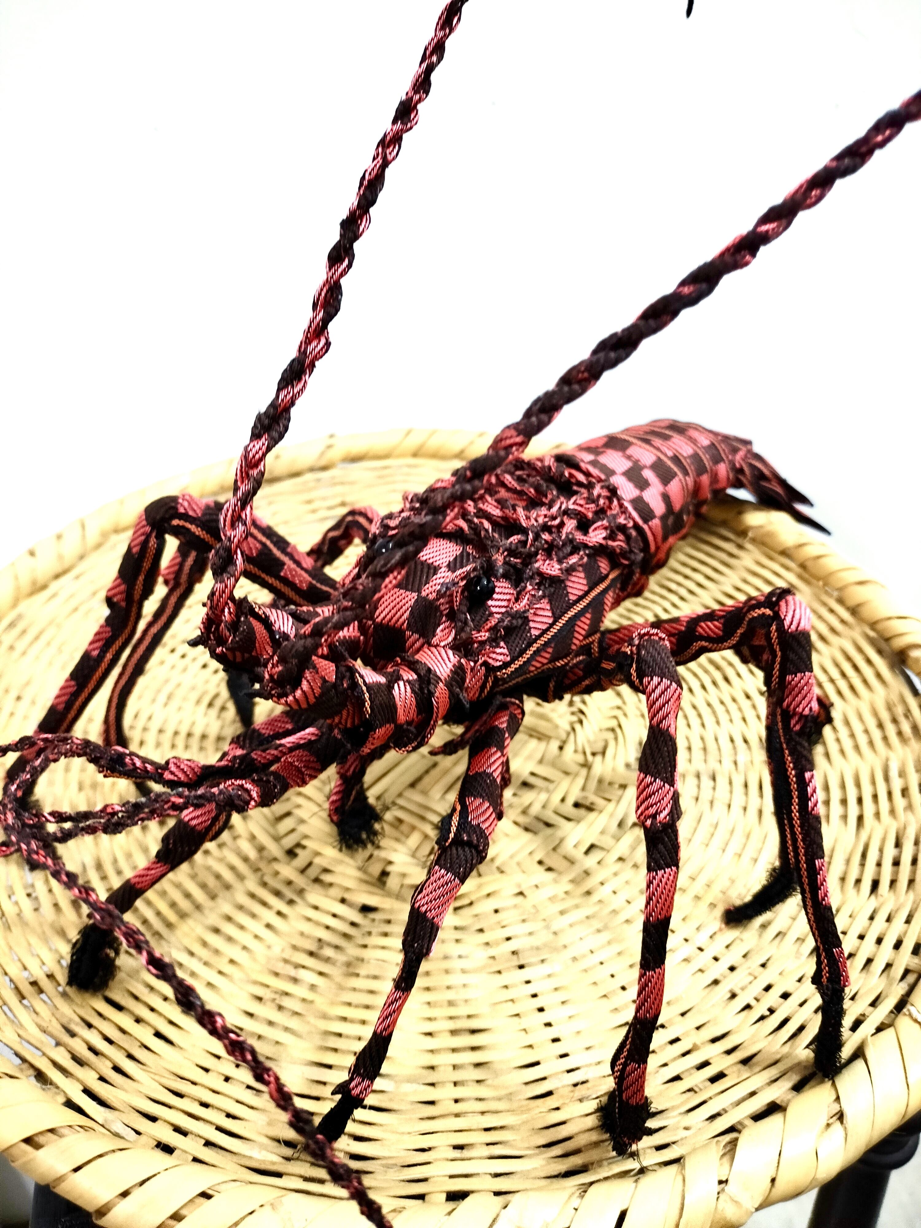 岡山県特産の畳縁(髙田織物製)を使用し、綯う・結ぶ・縫う・組むという手仕事で可能な限り精密に仕上げた伊勢海老型の置物